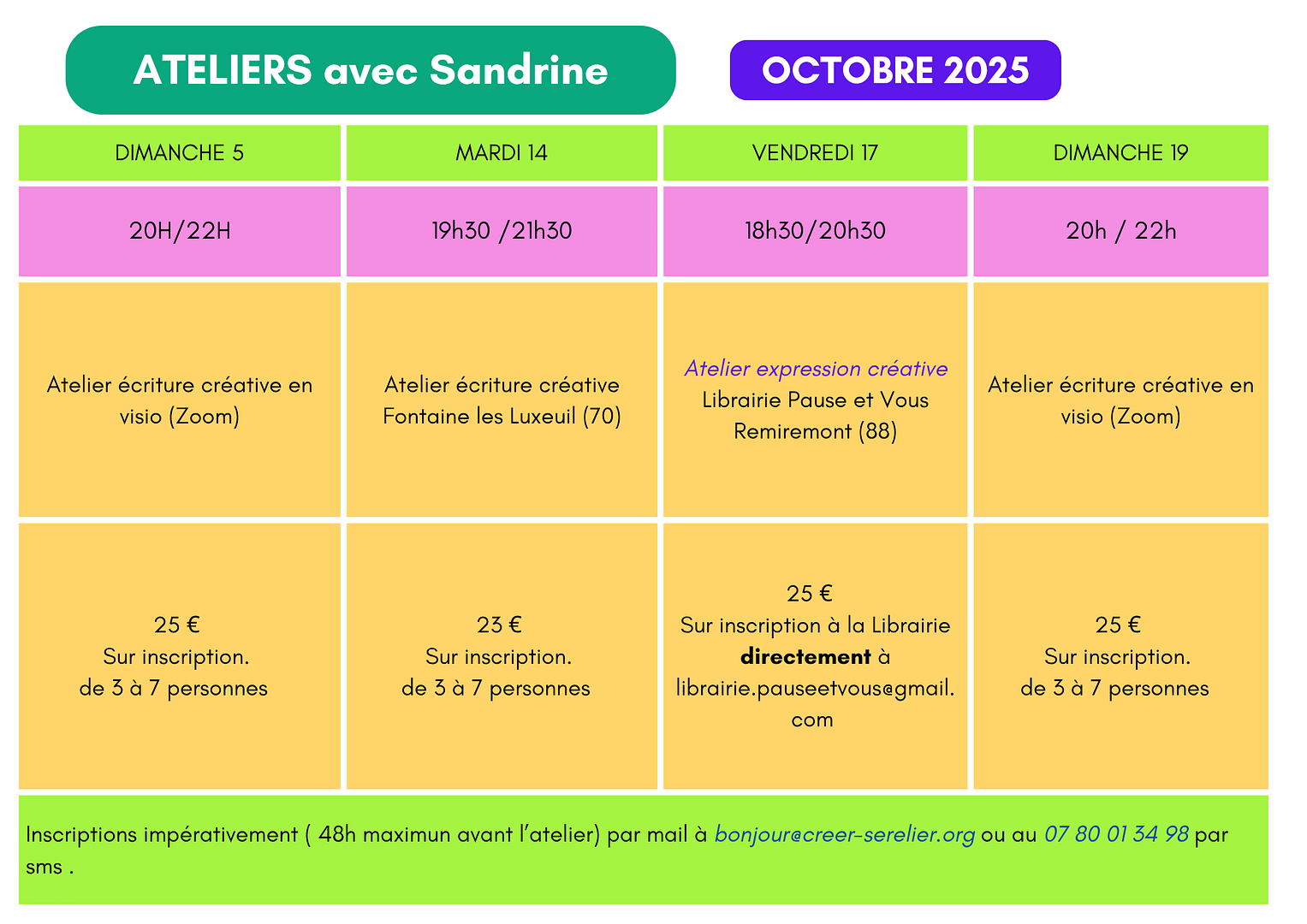 Agenda des activités Pour vous inscrire à un atelier : Contactez moi Pour vous inscrire à un atelier : Contactez moi Pour vous inscrire à un atelier : Contactez moi